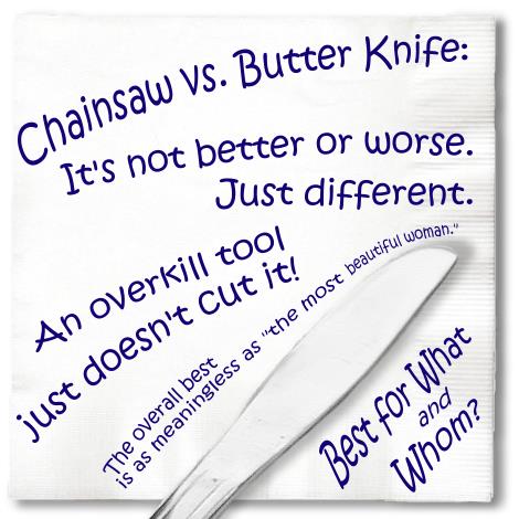 The Best There is no absolute best. General or overall best (for the proverbial average human) is irrelevant to you. Best is always qualified: Best suited. Best-of-breed. Best choice. Best compromise. Best within your means. Best results for your exact situation. Best until better ones come along. Get what you need, want and like. Never confuse best known, bestsellers or even "best deals" as "best." "Best" is an elusive thing, hinging upon your criteria of the moment, and often subjective and biased. |