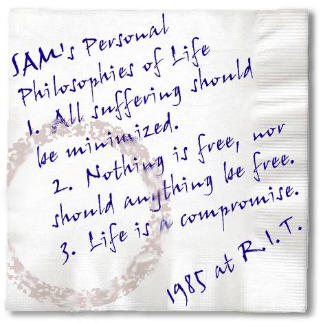 The 3 Basic Rules I have always been the pondering type since very young age. This list solidified one day in 1985. I was pursuing a master degree in Computer Engineering at R.I.T. I worked as a tutor for undergraduate Computer Science students. I often spent the time between appointments at the cafeteria. I found it rather inspirational to be in my own quiet corner among a busy crowd. On occassions, philosophical thoughts occurred and I wrote them down. As I get older, I've found everything in life is either related to these three fundamental points, or can be explained by them. |
