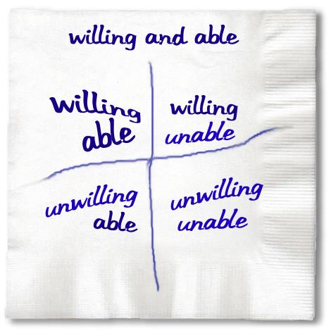 Willing and Able Think about the four quadrants. Where do they fit in? Very often that'll explain why people do or not do things. Asking questions such as: "Are they willing to?" and "Are they able to?" will inevitably lead to questions of "why?" and "why not?" Those will ultimately lead to issues such as ability, skills, knowledge, information, clout, financial capital, accountability, performance metrics, incentive systems, compensation schemes, will power, roles and responsibilities, competition, choices, disclosure, truth in advertising, loyalty, confidentiality, neediness (on both sides). |